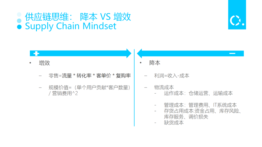 RC:是的。通过这两组公式,我们就可以知道怎么实现供应链的“降本增效”。乘法思维用到的两个公式是:零售额=流量转化率客单价*复购率,规模价值=(单个用户贡献客户数量)/营销费用∧2。这两个公式都可以反映出物流对于跨境电商业务的影响和作用。