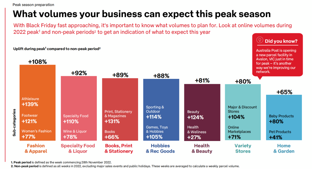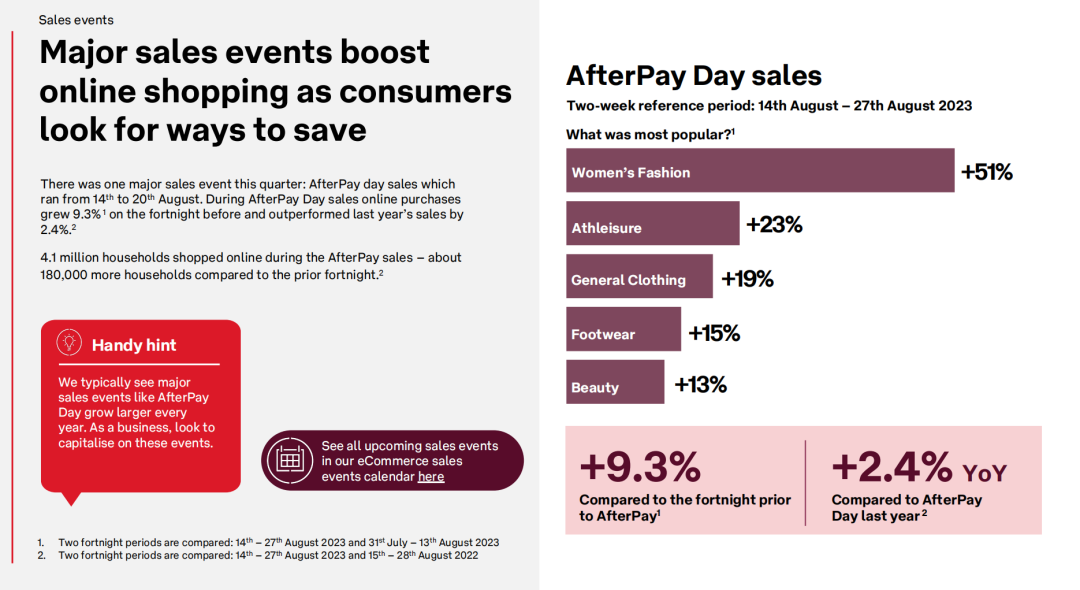 澳大利亚邮政的报告还分析了 2023 年第二、三季度的一些重要的销售活动对在线购物的影响。例如: