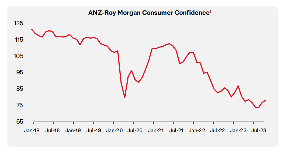 根据国外研究机构 ANZ-ROY MOGAN 报告(10 月 3 日),消费者信心指数上升 1.8 点至78.2。坏消息消费者信心指数持续低迷,好消息是最新数据显示触底回升。