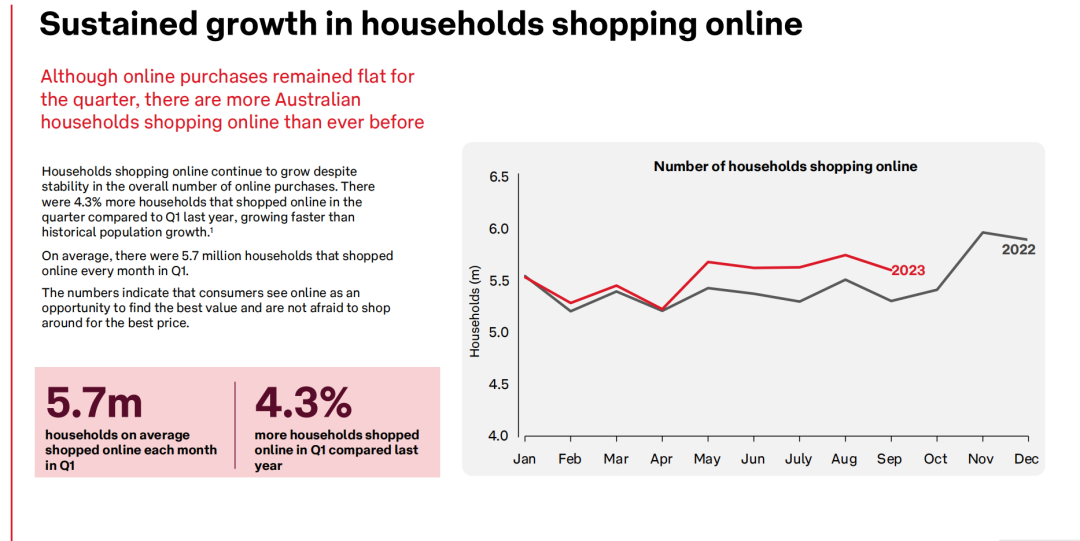 家庭线上购买持续增加,每月平均有 570 万家庭线上购物,同比增长 4.3%;