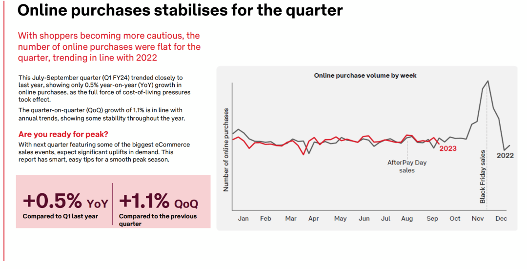 此外,澳大利亚邮政(Australia Post)每季度发布一份电子商务报告,分析了澳大利亚在线购物的市场动态和消费者行为。最近发布的 2023 年 10 月份的报告和早前 7 月份的报告显示了一些有趣的发展趋势,对于即将到来的旺季,跨境卖家有哪些些值得关注和借鉴的地方,我们一起来研究一下。