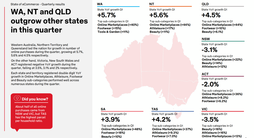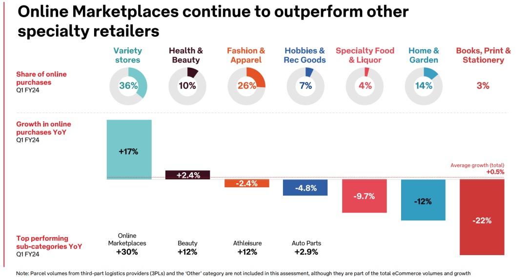 澳大利亚在线购物的同比增长率为0.5%,总体保持稳定;