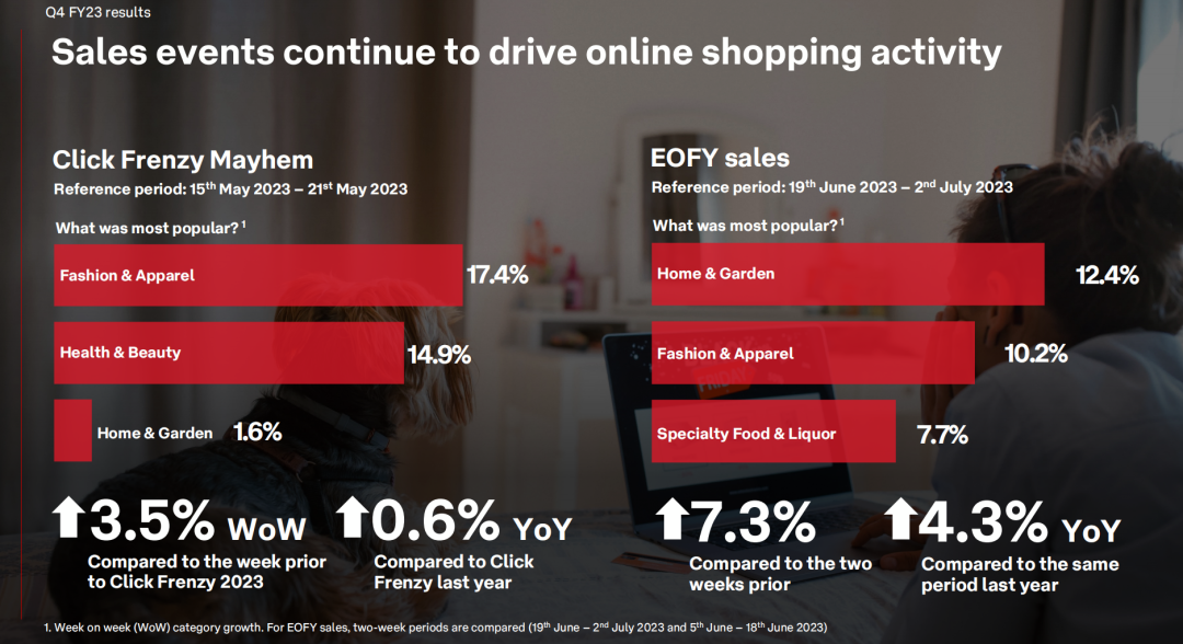 EOFY sales (旧财年清仓大促-6 月中到 7 月初): 同比两周前增长 7.3%,同比去年增长 4.3%。